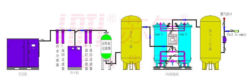 環(huán)境空氣經(jīng)壓縮凈化,除去油、水、塵后,進(jìn)入由兩個裝填有碳分子篩的吸附塔組成的變壓吸附裝置。壓縮空氣由下至上流經(jīng)吸附 塔,其間氧分子在碳分子篩表面吸附,氮?dú)庥晌剿隙肆鞒觯M(jìn)入粗氮緩沖罐,經(jīng)過一段時間后,吸附塔中碳分子篩被吸附的氧飽和,需進(jìn)行再生。再生是通過停止吸附步驟,降低吸附塔壓力來實(shí)現(xiàn)的。兩個吸附塔交替進(jìn)行吸附和再生,從而確保氮?dú)獾倪B續(xù)輸出。