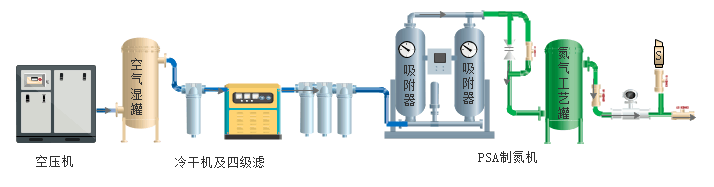 空壓機(jī)→空氣緩沖罐(濕罐)→C級(jí)過濾器→冷凍式干燥機(jī)→T級(jí)過濾器→A級(jí)過濾器→H級(jí)過濾器→制氮機(jī)主機(jī)→氮?dú)饬髁?,純度,壓力檢測(cè)→氮?dú)鈨?chǔ)氣罐→使用點(diǎn)